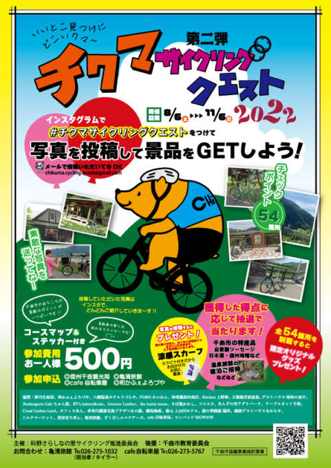 チクマサイクリングクエスト2022が8月6日から11月6日まで開催中です。このイベントは、千曲市おすすめスポットを自転車でめぐり、撮った写真をインスタグラムにあげてポイントを集めるインスタフォトラリーです。たくさんポイントを集めて素敵な景品をGETしてください!