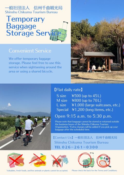 チェックイン前後の周遊観光、シェアサイクルご利用時など、大きい荷物を預けられたら…という皆さまのご要望にお応えして、この度、信州千曲観光局にて手荷物預かりサービスを始めます!